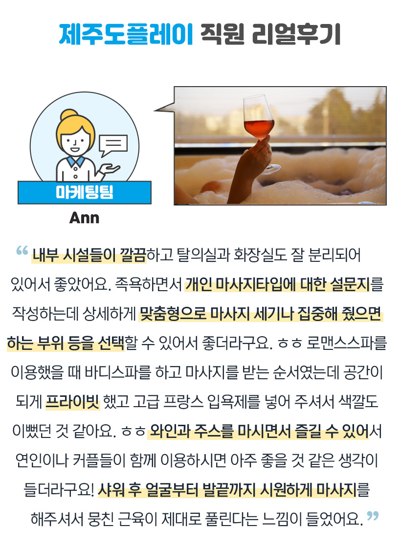 여행 일정중에 가장 릴렉스한 날이었습니다!! 가족여행이라 진짜 스트레스 많았는데 스파 받고 다 풀렸어요 ㅎㅎㅎ스파 테라피스트님들이 다 개인에 맞게 압도 조절해주시고 피로한곳들을 잘 풀어주셔서 덕분에 여행 마무리까지 힘내서 할 수 있었습니다!! 다음에는 남자친구랑 커플마사지도 받고싶어요~! 마사지룸 안에 스파도 너무 좋아보이더라구요 ㅎㅎ다음에 중문 가게되면 또 방문하겠습니다~!!